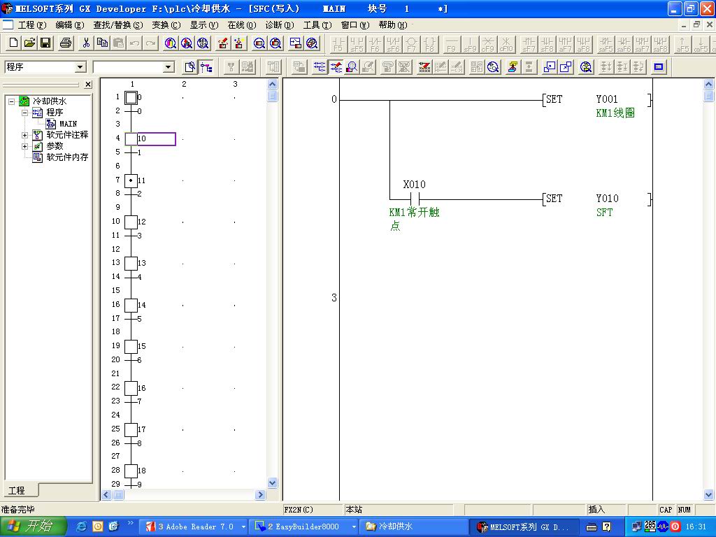 這個(gè)程序是用SFC編的,右邊的梯形圖是SFC圖中帶藍(lán)框那個(gè)狀態(tài)的驅(qū)動(dòng)程序,選擇工程,編輯數(shù)據(jù),改變數(shù)據(jù)類(lèi)型,選擇梯形圖語(yǔ)言,便可顯示全部的梯形圖