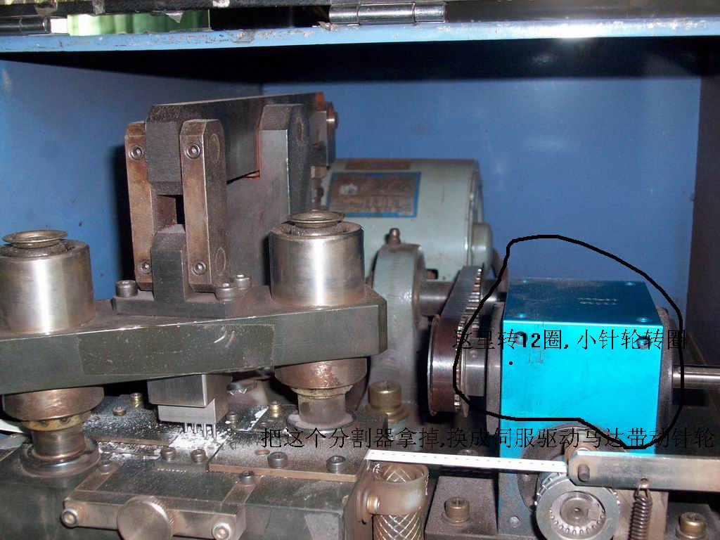 圖中用黑框圈起來的就是分割器,  分割器上皮帶帶動的那個輪子轉12圈,  分割器的小針輪就轉1圈