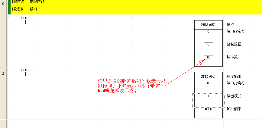 用cpm1a控制步進驅動器,寫了如圖的梯形圖,不知能否運行,有些確實搞不懂,比如bcd碼怎樣表示等等,問題在以下圖中,麻煩解答,O(∩_∩)O謝謝!