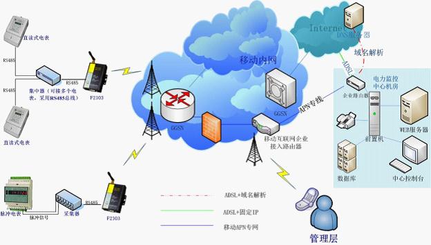 本系統由電度表,采集器,F2103 GPRS IP MODEM傳輸終端,帶系統軟件的主站組成。手持終端是本系統的補充,在系統出現意外時進行人工抄表。