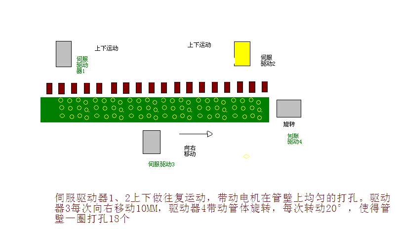 有個項目,是在一個直徑為50CM的管壁上均勻的打孔,打孔采用20個變頻器電機,其他的采用4個伺服電機,上面兩個伺服電機同步升降,帶動變頻器打孔,最右面的每次旋轉一定的角度,使得管壁一圈均勻打孔,下面的伺服電機打孔時向右移動30MM,使得多次移動打完長度為5米的管子,本來打算采用數控系統,感覺有點大材小用,而且價格昂貴,想采用PLC加定位模塊,不知道是否可行,大家給個建議,怎么控制簡單而又實用。簡單畫了示意圖