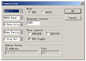 Modbus通信協議分為兩種串行通信模式,ASCII 和RTU 通信模式。在使用時,需要先設定通信模式以及串行口RS232、RS485的通信參數(波特率,奇偶校驗,從機地址,數據位,停止位,字節順序),在Modbus 總線上的所有設備應具有相同的通信模式和串行通信參數