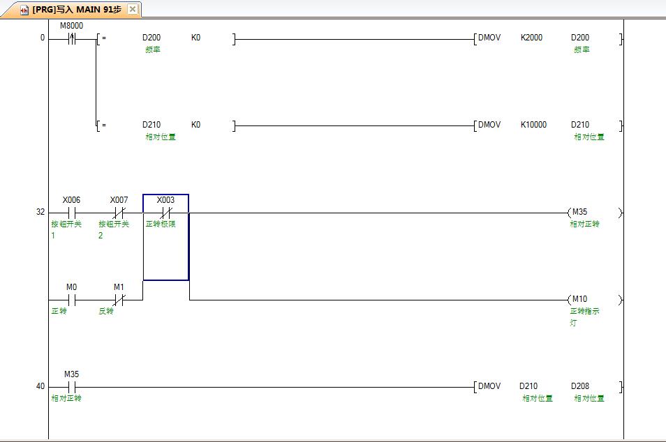 這是一段手動點動控制伺服電機正反轉的程序,采用的是相對定位指令drvi,電機每次走的位置就是上面寄存器設置的相對位置,你可以先熟悉下drvi指令的用法