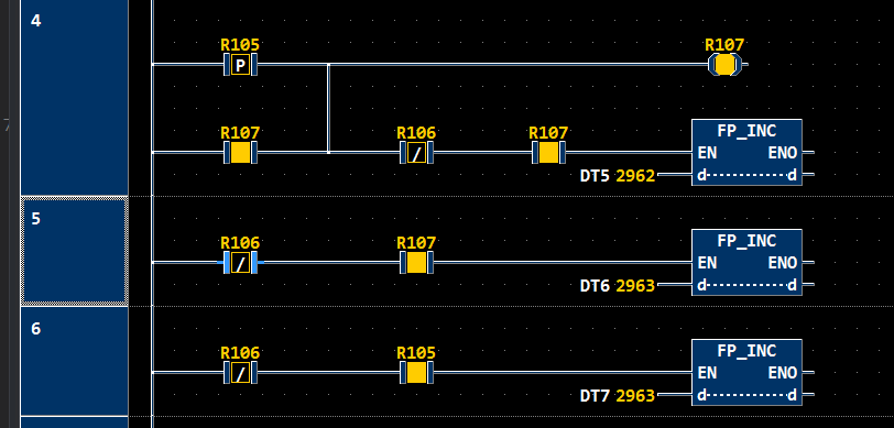 松下PLC =>R105 ON ,DT5與DT6開始累加計數,R106 ON 停止DT5與DT6累加計數,可以發現DT5比DT6少1,R107的狀態不會立即改變,要完成區塊4的運算後才會改變