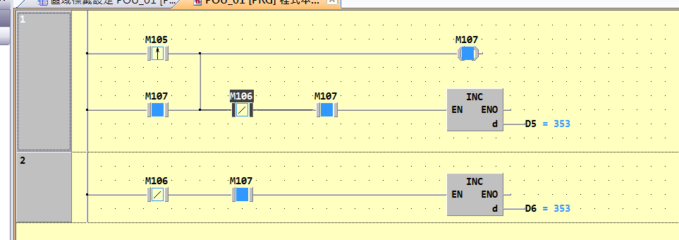 三菱PLC =>M105 ON,D5與D6開始累計,M106 ON 停止D5與D6累計,M107的狀態是立即改變,所以D5的值與D6一樣