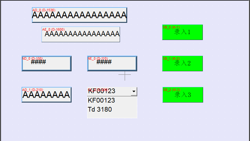 如圖所示,有2個問題要請教一下大家,1.點擊錄入1按鈕,字符元件D1600中的內容送到D1536內,現已與臺達PLC聯機實現功能,但是無論D1600中的字符串多長,D1536中最多只能顯示4位字符,請問如何用一個字符元件顯示多個字符?2.需要實現的功能:點擊錄入3按鈕,需將項目選單元件D200中選中的字符串,送到D210中,目前該功能未實現,請問除了用宏指令外,還有其它方法實現嗎?謝謝大家!