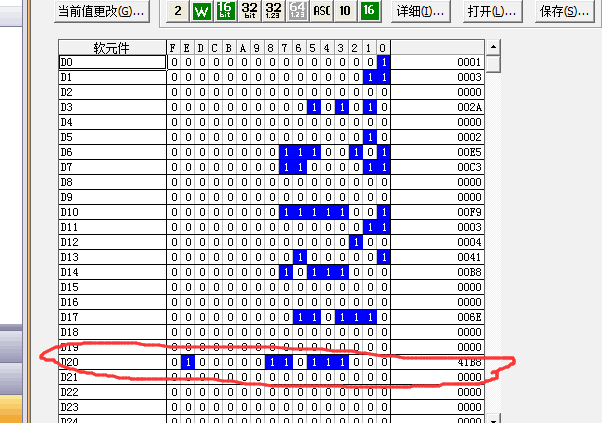 引用引用第1樓ymmfa于2018-06-21 12:45發(fā)表的 :我剛做了一個測試:[DEMOV E23 D0] 監(jiān)視D0,16進制時是41B8,和你的一樣。然后我用指令[DINT D0 D10],這時D10就轉(zhuǎn)成整數(shù)了,10進制是23,16進制是17。
