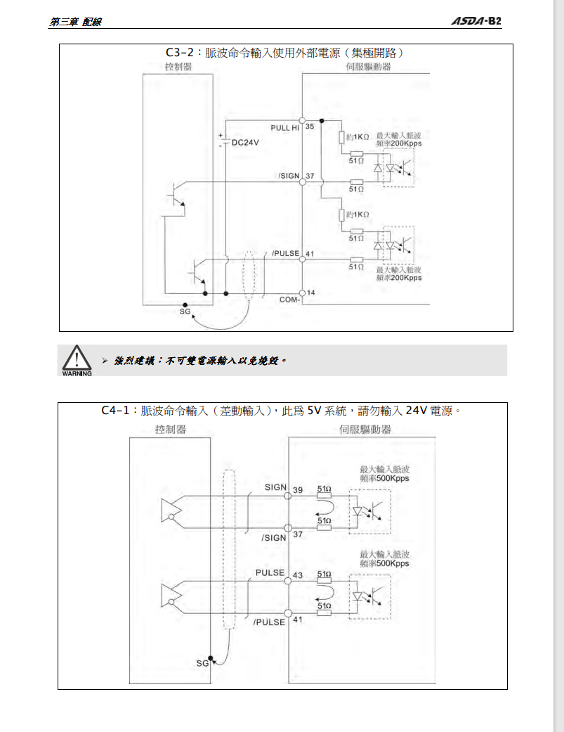 要不就是接線錯了,電流方向不對。要不就是高速光耦因為接線燒了,我記得這個B2系列伺服驅(qū)動器是分5v和24v的輸入的。