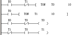 2。時間繼電器T0時間到,Y0前的T0斷開,Y1前的T0接通,此時Y0 OFF    Y1 ON ;時間繼電器T1開始計時