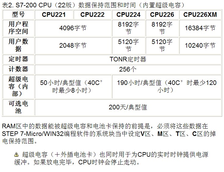 在CPU內部靠一個超級電容,在掉電后為RAM存儲器提供電源緩沖,保存時間可達幾天之久,具體時間見表1、表2。CPU上電時,超級電容就可以充電。要獲得規格表中的數據保持時間,電容必須連續充電24小時。