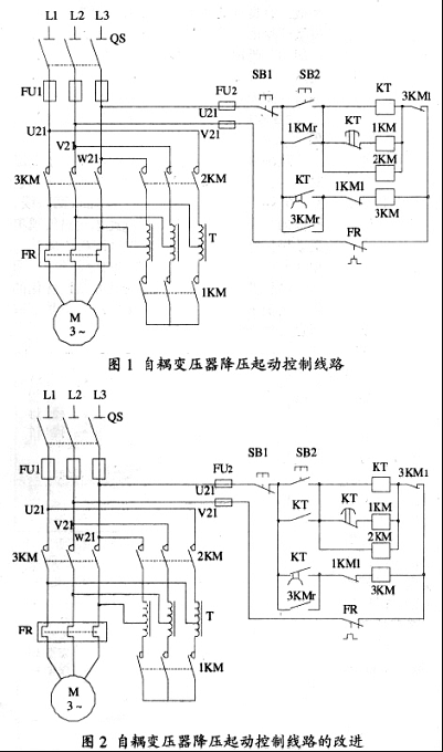 自耦變壓器降壓起動, 又稱為補償器降壓起動, 可用抽頭調節自耦變壓器的變比以改變起動電流和啟動轉矩大小。傳統自耦變壓器起動大多數是用加時間繼電器來控制。以下是根據某本中級電工培訓指導書上自耦變壓器降壓起動控制線路所存在的弊病做了改進。改進后的控制線路投入使用以來, 運行穩定、可靠, 沒有出現故障。