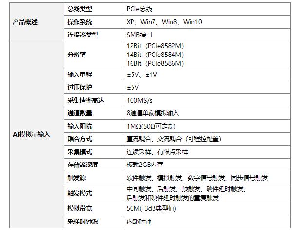 PCIe8582M/8584M/8586M高速AD采集卡,該板卡提供8通道12/14/16位100MS/s采樣數(shù)字化儀,專為輸入信號(hào)高達(dá)50M的高頻和高動(dòng)態(tài)范圍的信號(hào)而設(shè)計(jì)。模擬輸入范圍可以通過軟件編程設(shè)置為±1V或者±5V,配備了容量高達(dá)2GB的板載內(nèi)存。