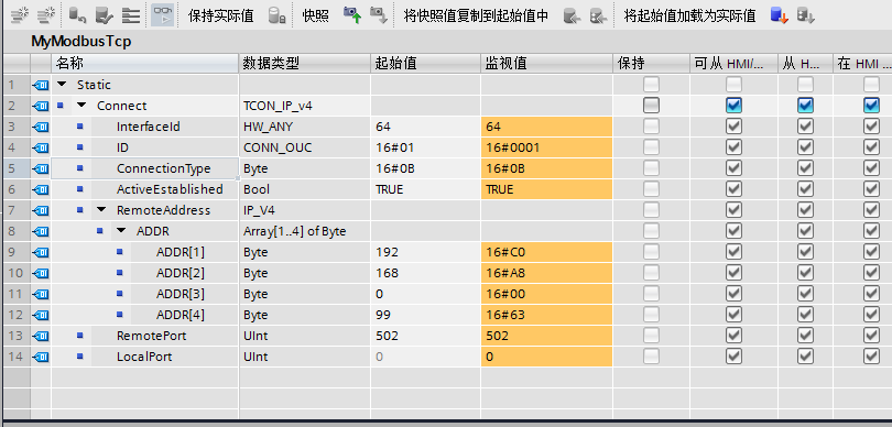 后者要分別在DB塊的初始化數(shù)據(jù)中指定主站IP 從站IP. 連接類型TCP/IP 從站主動連接TRUE.