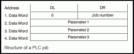 一個 PLC 作業(yè)包含 4 個數(shù)據(jù)字。第一個數(shù)據(jù)字包含作業(yè)號。根據(jù)所指定的作業(yè)號功能,最多可以在數(shù)據(jù)字 2 到 4 中傳入 3 個參數(shù)。下圖顯示了該數(shù)據(jù)結(jié)構(gòu)。