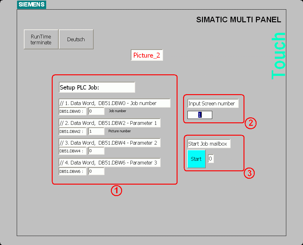 * 通過控制器將希望調(diào)用的畫面編號輸入作業(yè)信箱的第二個數(shù)據(jù)字( DB51.DBW2 )。如果需要,還可以在作業(yè)信箱的第四個數(shù)據(jù)字 ( DB51.DBW6 ) 中輸入畫面中相應(yīng)的域號。