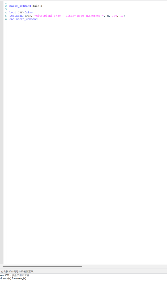 引用引用第4樓夢雨天涯于2025-06-17 12:19發(fā)表的 :bool OFF=falseSetDataEx(OFF, "Mitsubishi FX5U - Binary Mode (Ethernet)", M, 370, 1)SetDataEx(OFF, "Mitsubishi FX5U - Binary Mode (Ethernet)", M, 371, 1)SetDataEx(OFF, "Mitsubishi FX5U - Binary Mode (Ethernet)", M, 372, 1)這樣才對,OFF只是占用一個地址