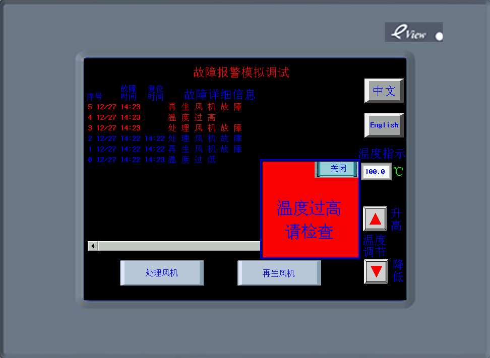 最近做了個故障報警模擬調試界面,是用eview的MT5400T做的,拿來和大家分享一下,不足之處請指正。