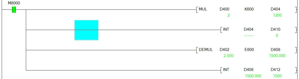 浮點數占用兩個D,DEMUL要占4個,你的D404和D402是不是有問題???
