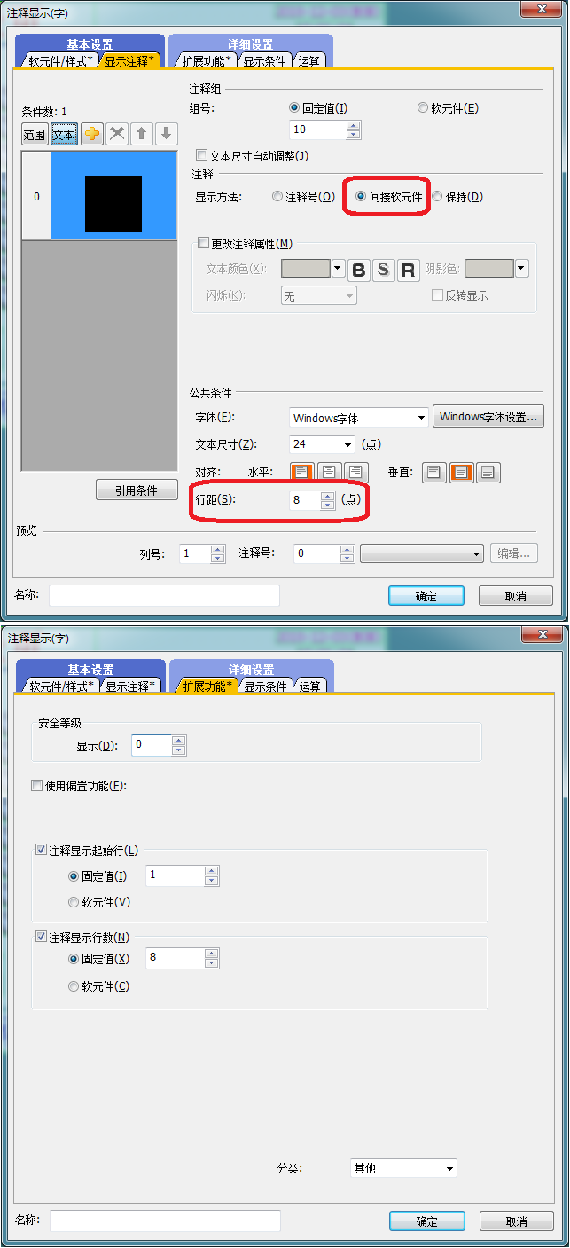 【顯示注釋】中設置為間接軟元件,且通過【行距】調整注釋與畫好的表格對齊。