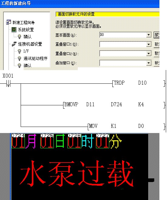 比如PLC    X1(水泵過載)閉合如何在觸摸屏上顯示水泵過載(出現1秒就自動消失),而且有個報警畫面單獨存儲報警記錄(顯示什么故障,時間)可供查詢