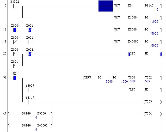 自己參照資料寫了一個脈沖輸出程序,做仿真的時候,Y000怎么總是OFF狀態 ,還有Y002怎么控制它的ON /OFF狀態,請大俠幫分析下,謝謝