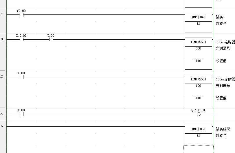 多謝大俠提示,原來OMRON的跳轉是當JMP(04)執行條件為OFF時候直接跳到轉編號相同的JME(05),并執行其后面的程序,而三菱的CJ執行條件為ON時候,程序跳到母線左側對應的指針,并執行后面的程序,三菱的CJ沒有對應的結束指令,歐姆龍的JMP和JME配套使用