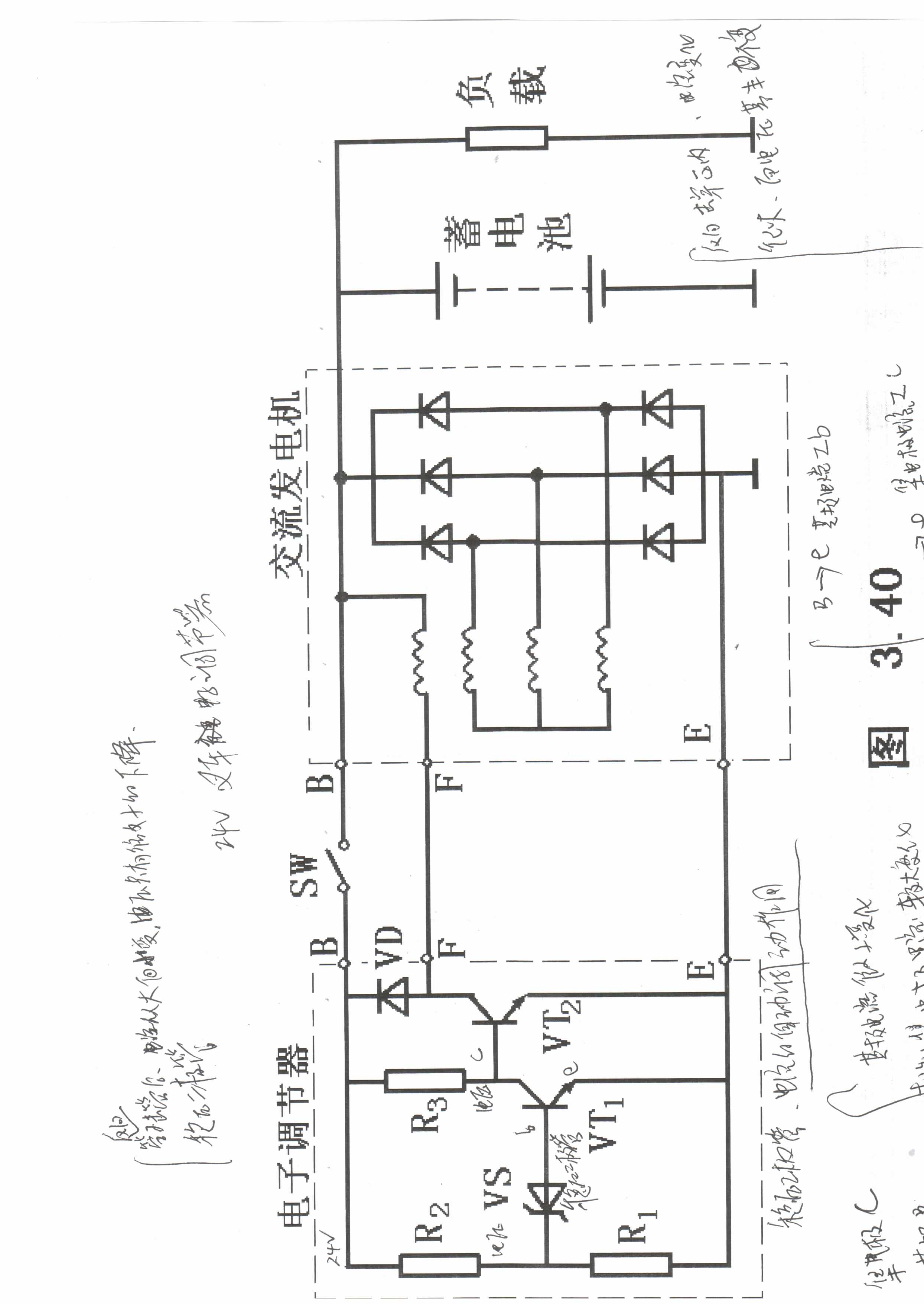合上開關SW后,實際發電機的充電電壓,通過R2、R1分壓采樣到穩壓管VS的陰極,此時電壓達到或者超過穩壓管的標稱值時,VT1基極得到的電壓大于0.6~0.7V使它導通。由于VT1導通使VT2的基極電壓下降到0.2~0.3V之間而截止,這時交流發電機“F”點回路電流下降,電流下降而使整個系統(充電)電壓下降,電壓下降使VT1基極電壓同時下降而使VT1截止,VT2由于R3偏置電阻的作用而導通,系統電壓上升。這樣周而復始進行來控制系統電壓的穩定。