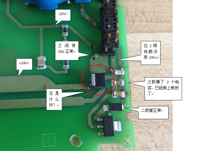 接錯線,導致端子的24V沒有了,拆開后,板子上爆了3個電容,已經換上新的了,但是端子還是沒有輸出24V,大家看哪里的事,我該怎么修?
