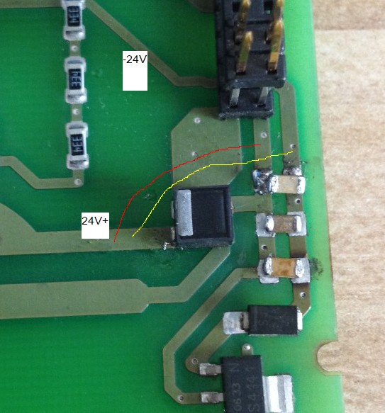 我試著短接了一下,短接其中那根紅線,板子直接不輸出24V了,只短接那根黃線沒問題。只短接這一根黃線應該不行吧。