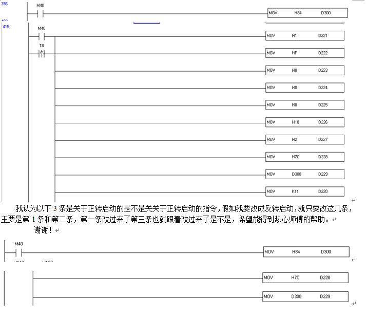 現(xiàn)我廠有一臺(tái)手工盆打磨機(jī)PLC為臺(tái)達(dá)DVPES2變頻器為海利普HLP-NV系,現(xiàn)因想改變一點(diǎn)點(diǎn)工藝,原來往下打磨和往上打磨都是正轉(zhuǎn),現(xiàn)在要改成磨頭往下打磨時(shí)正轉(zhuǎn),往上打磨時(shí)反轉(zhuǎn),程序采用通訊控制方式,可本人只是一個(gè)廠電工,生性愚鈍通訊怎么學(xué)都學(xué)不進(jìn)去,想請(qǐng)教一下哪些指令(段)與正轉(zhuǎn)控制有關(guān)系,哪些指令(段)為停止控制,如果我要加入反轉(zhuǎn)功能應(yīng)怎么改(第1009步S40通時(shí)正轉(zhuǎn)停止反轉(zhuǎn)開始),到家1140步)Y0結(jié)束后M1029通后反轉(zhuǎn)停止。