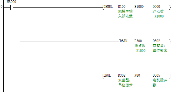 觸摸屏輸入數(shù)值一般都可以設(shè)置比例,輸入12.33,比例放大1000,PLC的值12330,移動(dòng)每0.001mm就是80,所需要的脈沖就是12330X80,盡量不要用浮點(diǎn).