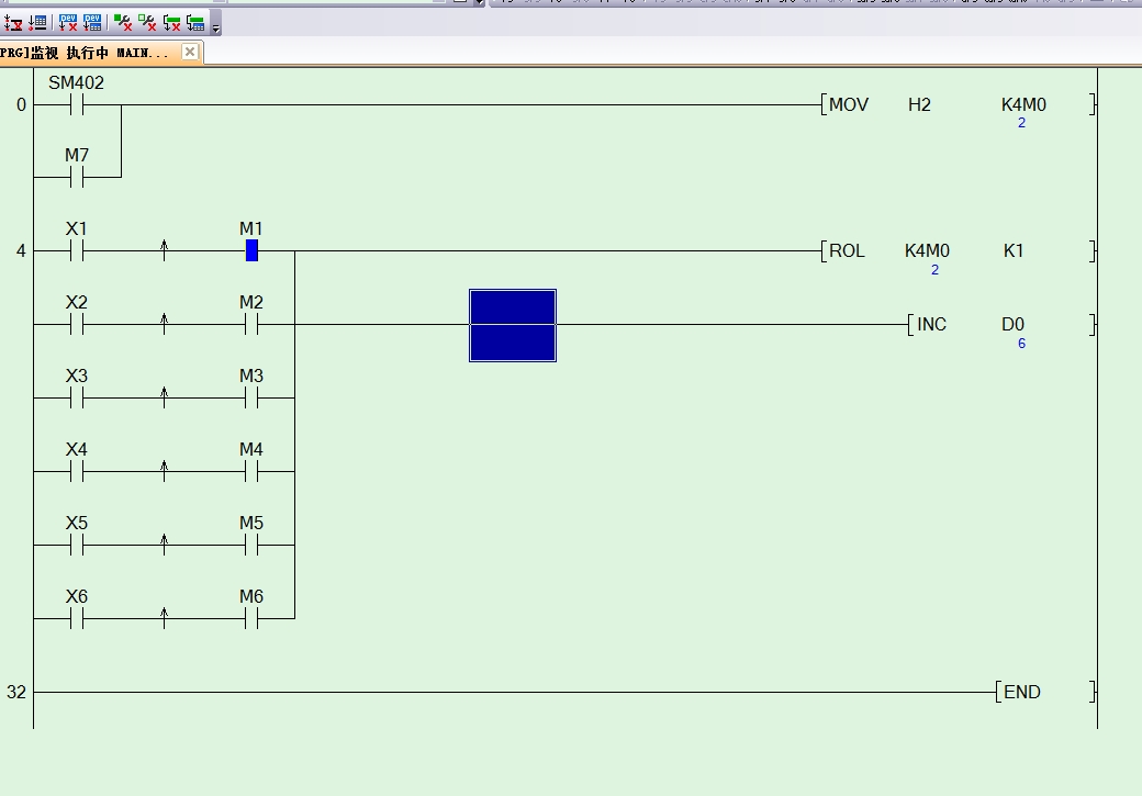 X1----X6依次對應6個接近開關用來計數,要求X1-X6必須嚴格按照1-6的順序輪流計數,X1--X2--X3--X4--X5--X6--X1--X2--X3--X4..................反復循環,計數值保存在D100里面,如果接近開關未按1-6順序輪流計數,順序錯亂要求輸出出錯信號停止主機,用比較指令來判斷位X1---X6相鄰兩個位的狀態但邏輯關系比較復雜請教高手有沒有比較簡便的方法。