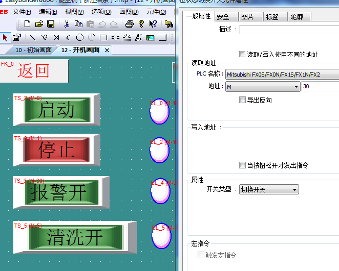 可以是同地址也可以不同地址,比如是m100,那么m100接通時該按鈕顯示綠色,未接通時顯示紅色,不同時:比如m100接通是y1輸出電機(jī)啟動,那么寫入地址是m100,讀取地址是y001。y001接通時按鈕綠色,如果電機(jī)碰到行程開關(guān)y001停止就顯示紅色,哪怕是m100繼續(xù)接通也是紅色