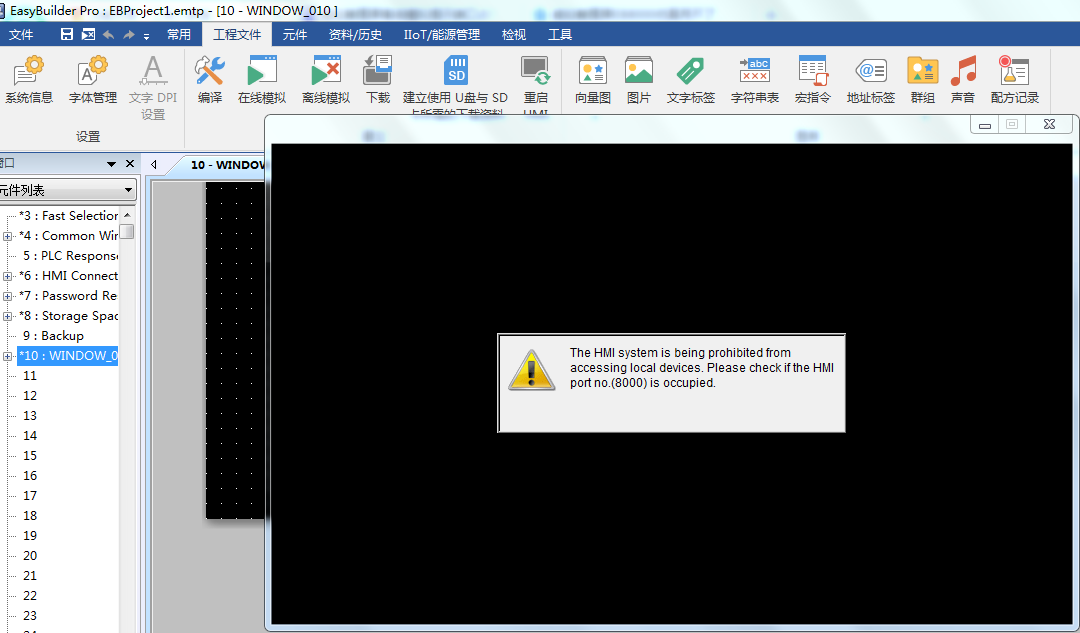 威綸EBpro離線模擬時彈出窗口,提示8000端口占用,下載了最新版本的軟件,重新安裝(安裝時360關閉),電腦重啟依然是這種情況,各位有無經歷過這種問題?請教各位怎么解決?謝謝啦