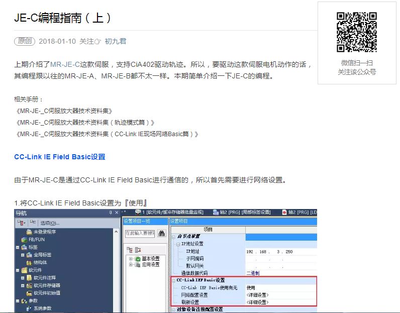 所以,其他6軸伺服不是通過脈沖的方式,而是通過網絡的方式,通過CC-Link IE Field Basic網絡的方式。之前在介紹CC-Link協議家族的時候簡單提到過這個網絡,說到『使用PLC的內置以太網口就可以進行CC-Link IE Field Basic的通信了』。所以FX5U是通過自帶的以太網口,通過CC-Link IE Field Basic協議來控制這其他6軸伺服的。這款伺服就是MR-JE-C。