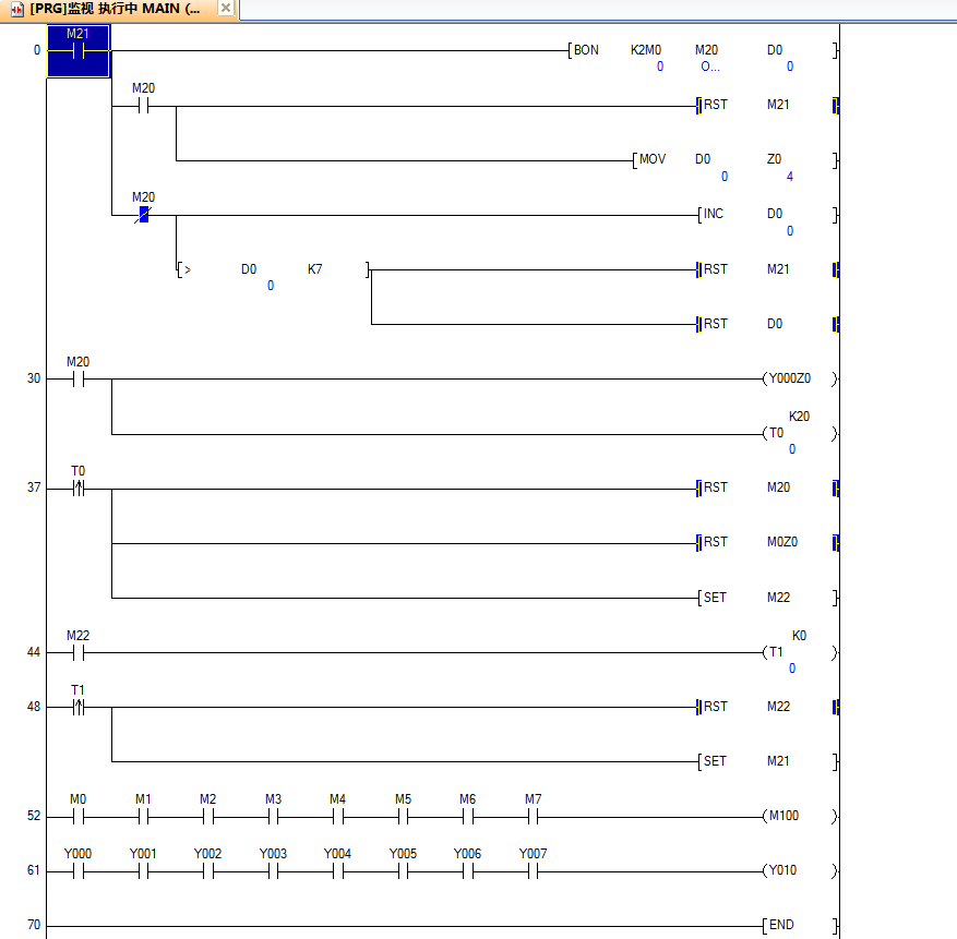 某機臺有10個電機,啟動時是手動,可以選擇啟動其中的若干臺,比如1,3,5,9,10,停止時是自動逆序停止,并且停止間隔一定(可設定),控制器用的是三菱的FX2N,比如10#停完2S停9#,9#停完2S停5#,5#停完2S停3#,等等,中間不能因為6,7,8沒啟動而延時8S停5#,