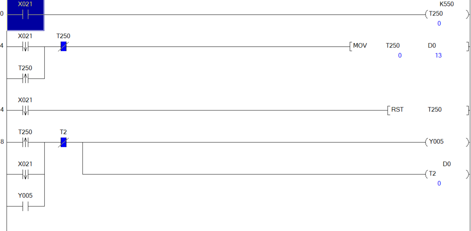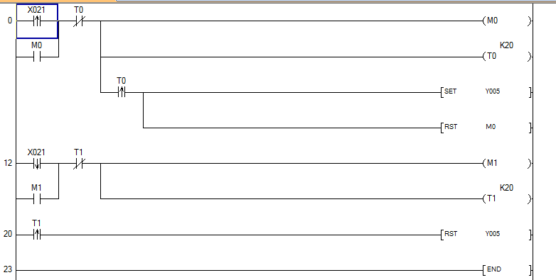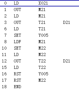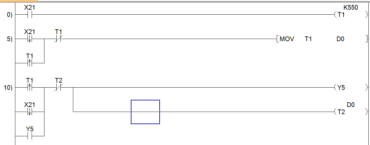 要求:只有一個限位開關 (X21)輸出是Y5    要求實現:當X21有信號后延時n秒后Y5有輸出,X21斷信號后Y5同樣延時n秒停止,時間n是不固定但一定是小于60秒的,