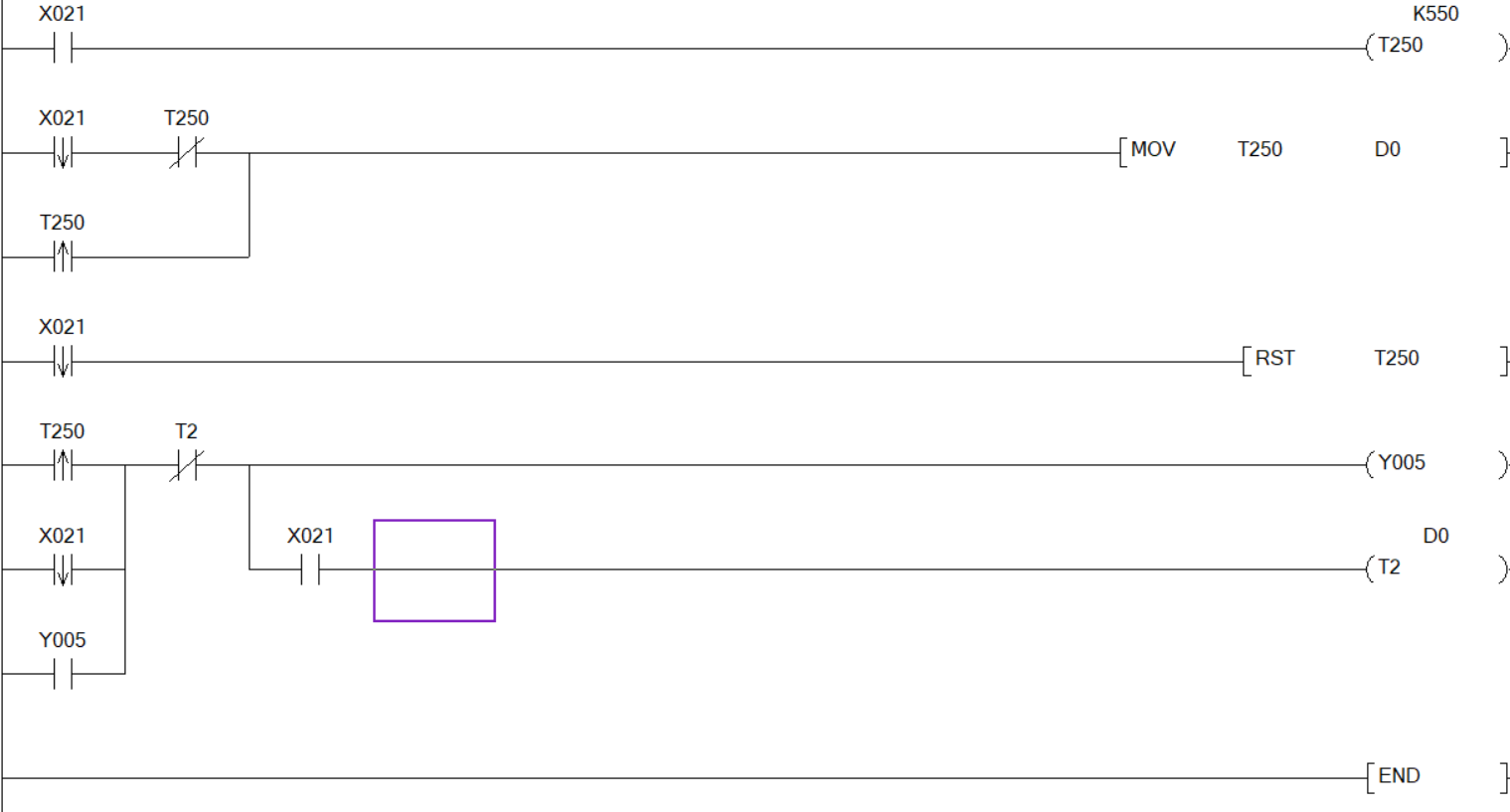 本來程序是工件到限位A這個位置是后,(其他限制條件不考慮)Y5就會有輸出,但現場A這個裝限位開關(X21)這個位置由于其他原因而向前移動1米的B位置,為了達到在A位置的效果,而我只能從程序上調整,讓Y5延時n秒打開,在需要斷開時再延時n秒斷開,但又碰到還有下面兩個問題需要解決
