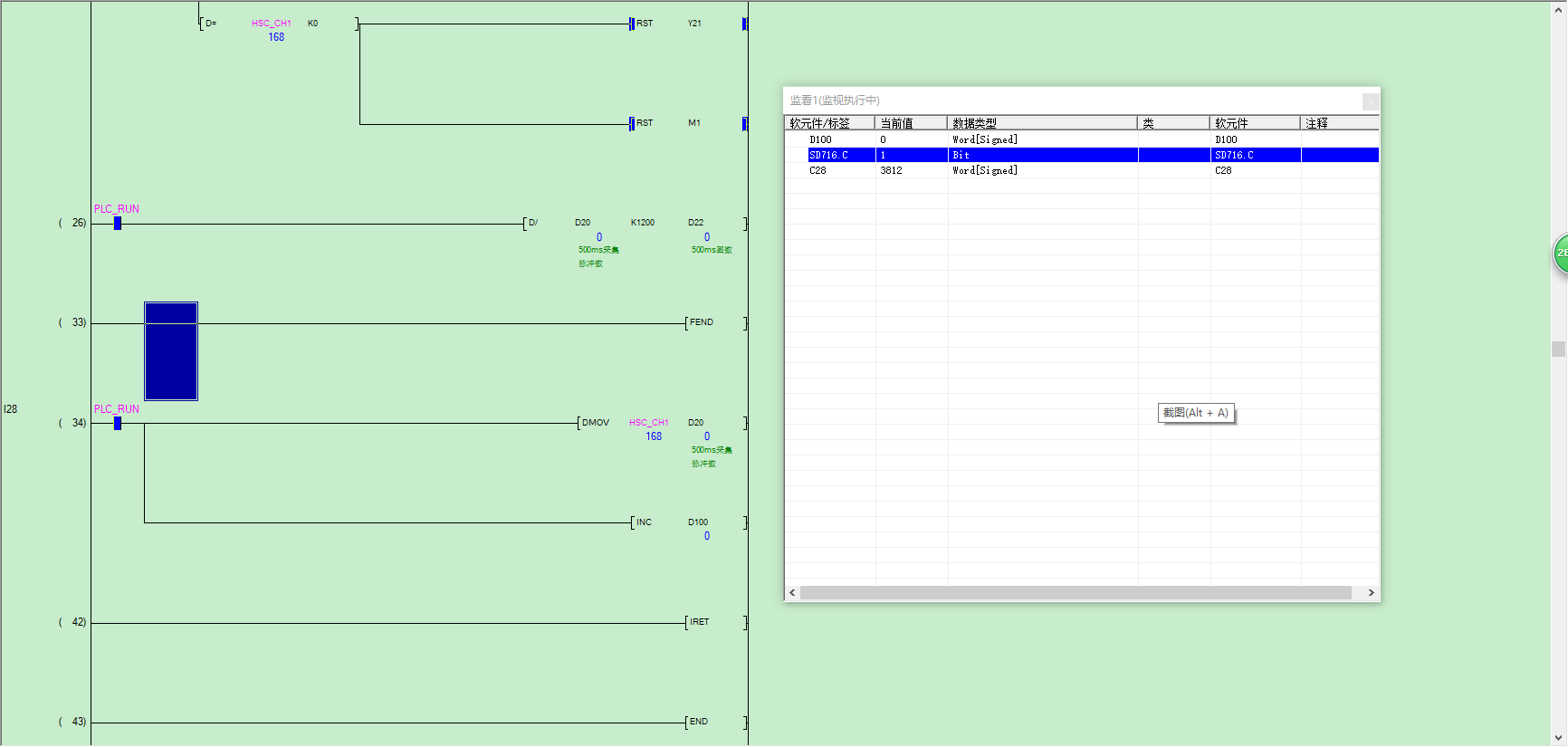 我也是相當疑惑,不知道問題出在哪里?按照編程手冊說的SD716的每一位就代表I16-I32中斷的開啟狀態,對應I28的SD716.C已經為1了。然后PLC參數里設置中斷計數器也是從C0開始的,對應I28的應該也是C28沒錯,而且計數的脈沖目測確實是按照為設置的1S鐘執行一次。然后I28里面的程序就是不執行啊