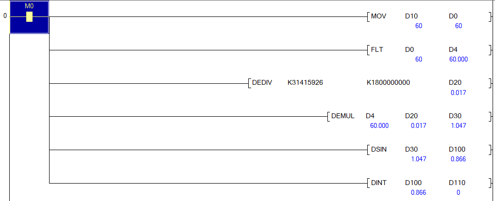 三菱PLC浮點數比較指令DECMP D0 D2 M0。