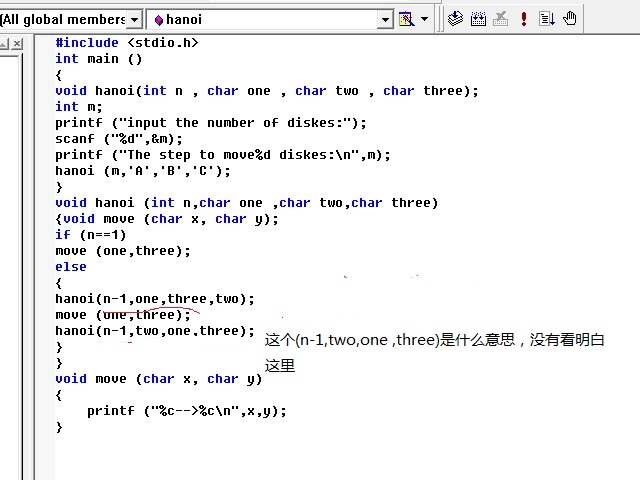 還有一處不明白,就是hanoi(n-1,two,one ,three)是什么意思?