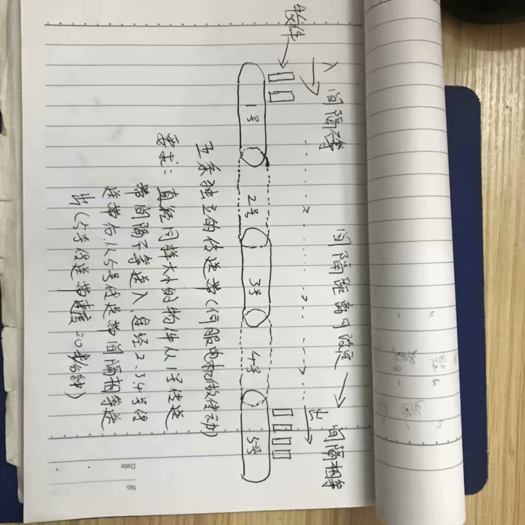 看這架勢是想在運動中做好整料分料的工作 個人感覺不需要這么多的輸送帶 2個應該就可以滿足要求的 第一個加個擋料的 然后把第一個和第二個的線速度設置好(間距設定就在這個地方設定)具體算法應該不需要給你公式吧? 不過算了一下你最后的那個5號輸送帶的速度有點小快的感覺 如果是2個的話 那你第一個的速度和他相差的不能太大 防止形成摩擦力不夠的情況(出現打滑)  個人感覺這個機械設計搞了5個輸送帶就是想解決這個問題的 但是還有一個問題 你2個傳送帶之間的間隔是怎么結合的 能不能給一個圖片瞅瞅