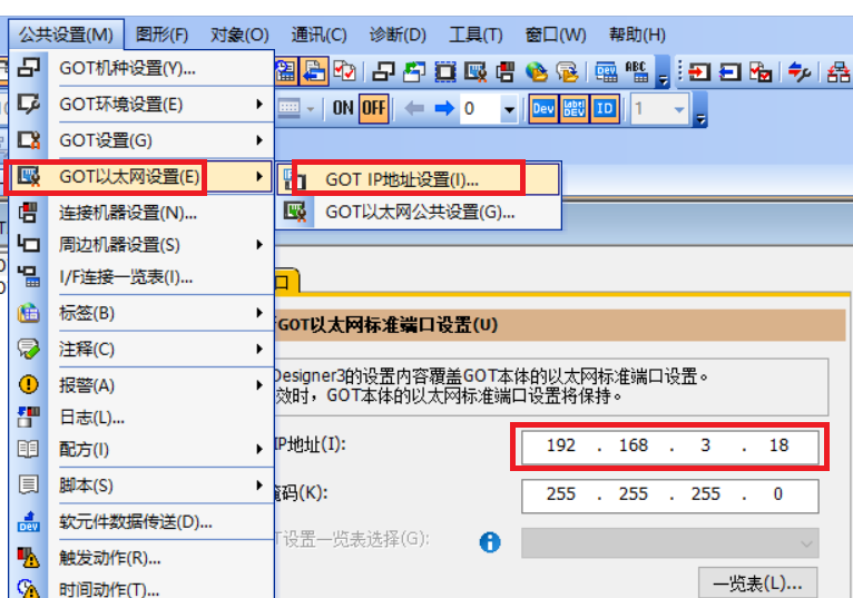 3、點擊 公共設置 ,GOT以太網(wǎng)設置,GOTIP地設置,確認一下IP地址: