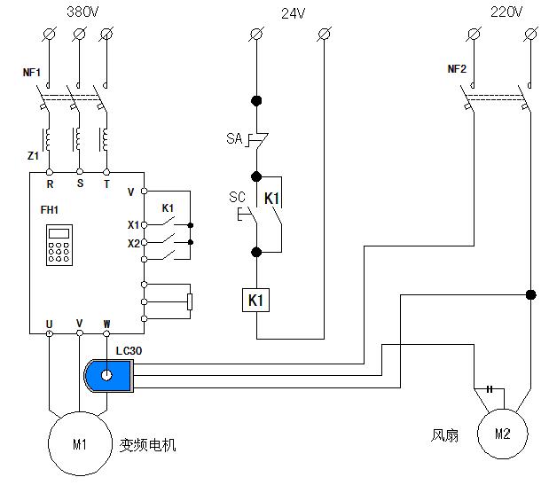 1 變頻器起停按鈕外加中間繼電器,用中間繼電器的一個輔助觸點去控制風(fēng)扇電源。變頻器啟動風(fēng)扇運轉(zhuǎn),變頻器停止風(fēng)扇停止。