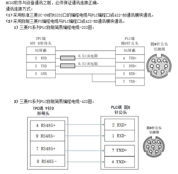 FX系列編程口圓8針公頭和昆侖通態TPC系列的DB9針母頭,自己做的話,按照圖上所示,232接法,最長多少米??422接法,最長多少米?