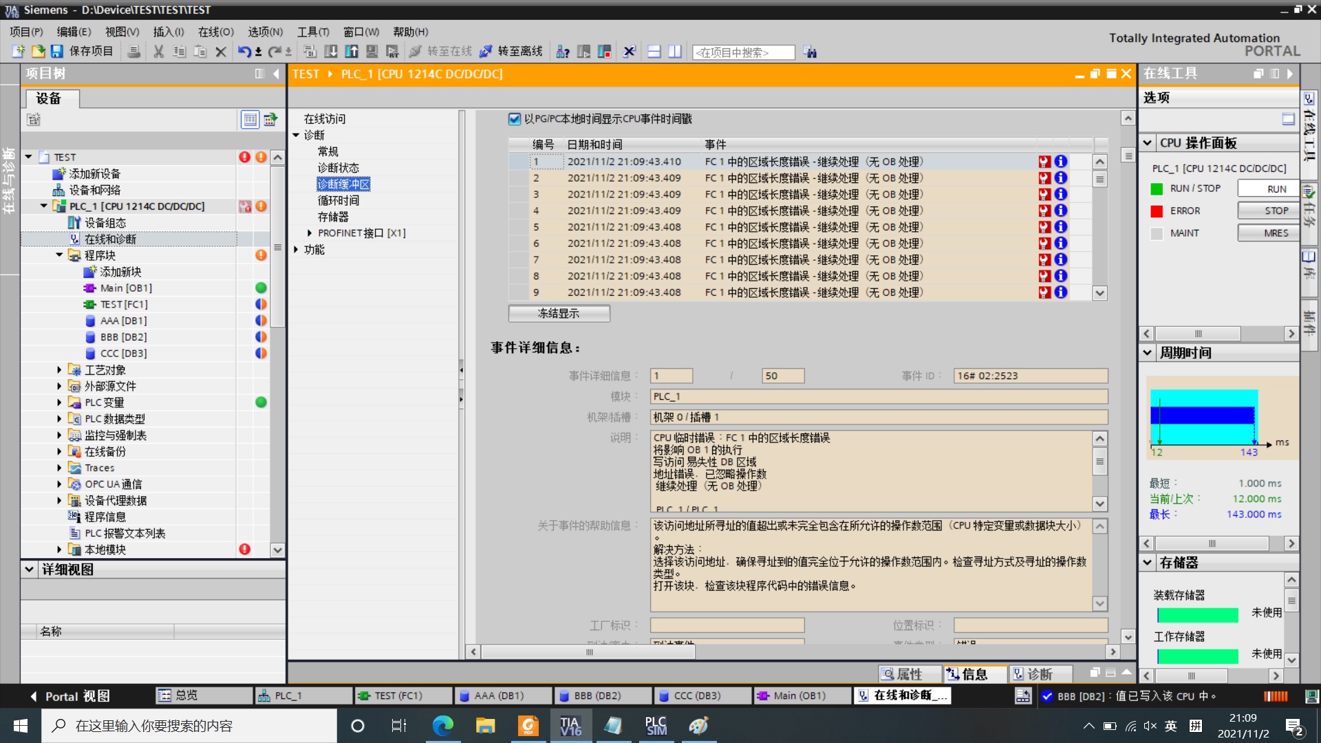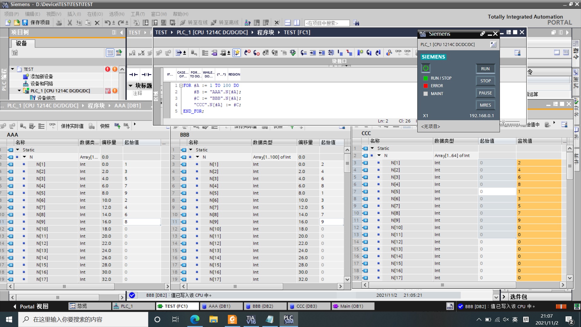 for語句執行100次,變量A的值從1到100,所以會出現CCC.N[100].但你組態的CCC數據塊最大只能到64.所以尋址錯誤