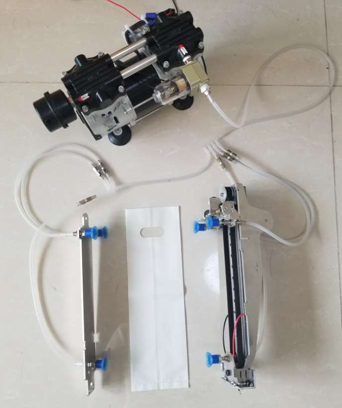整體線路如下圖所示,氣源用的是藤原的無油真空泵(流量:51/MIN,真空度:-0.098Mpa),通過硅膠軟管連接6個真空吸盤(盤徑25mm),每個吸盤都連接一個止回閥。要打開的是中間白色塑料袋,外面裝奶茶的那種袋子。