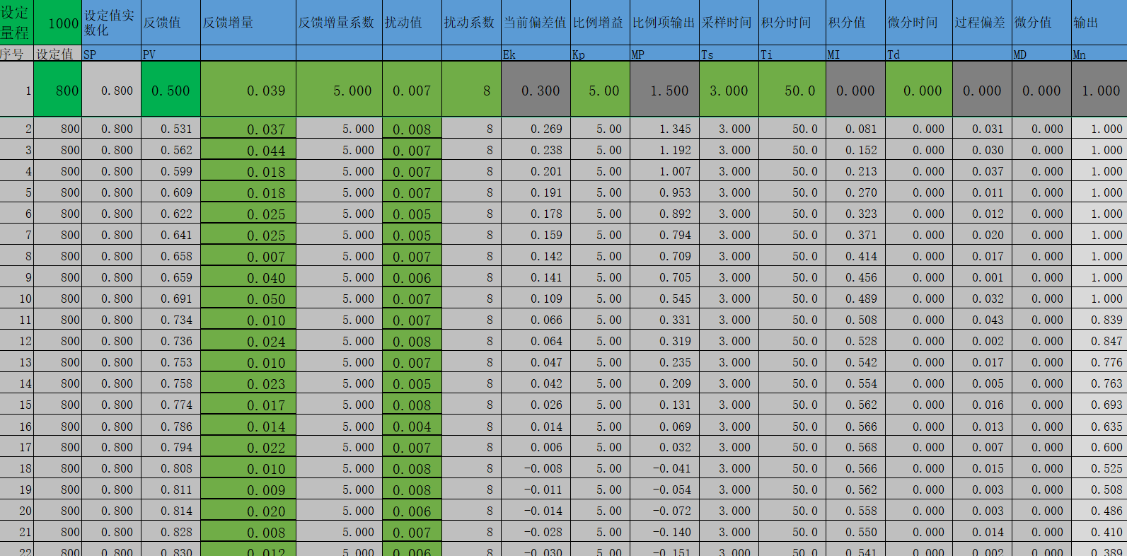 1.“設定量程“”為了方便設定值與反饋值換算為0-1的實數;“設定值”為需要達到的目標;              2. “反饋增量”是為了模擬執行機構的輸出對反饋值得影響,設置越大作用越強越明顯;              3.“擾動系數”是模擬實際應用中外部變量對反饋值得影響,設置越大擾動越強烈;