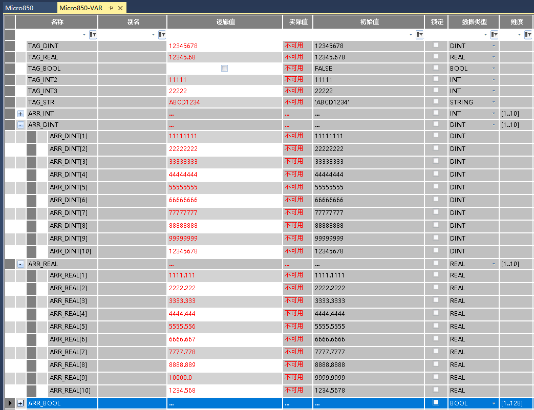 在AB的Micro850的PLC內(nèi)建立‘TAG_INT’、‘TAG_DINT’、‘TAG_REAL’3個(gè)全家變量,準(zhǔn)備將其數(shù)值分別寫(xiě)入到Smart的PLC的VW1000、VD1002、VD1006寄存器,數(shù)據(jù)類型分別為16位有符號(hào)整數(shù)、32位有符號(hào)整數(shù)、32位浮點(diǎn)數(shù);再建立‘ARR_DINT’、‘ARR_REAL’兩個(gè)數(shù)組,分別用于接收來(lái)自Smart的VD800~VD836、VD900~VD936的數(shù)據(jù)。