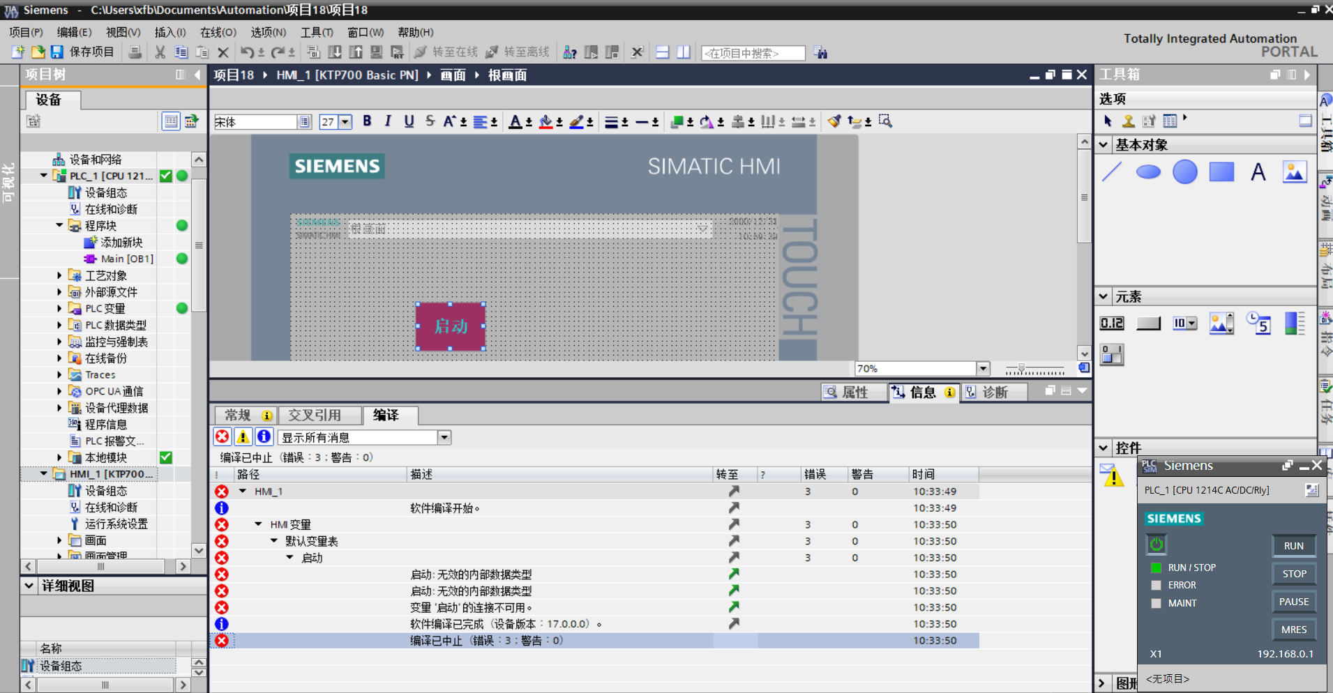 正確操作是 建立按鈕 建立HMI變量 連接HMI變量到PLC變量